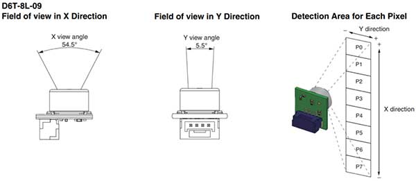 D6t mems thermal sensors d6t field of view characteristics p0 p1 p2 p3 p4 p5 p6 p7 p8 p9 p10 p11 p12 p13 p14 p15 x direction y direction x view angle 44 2 d6t 44l 06 field of view in x direction field of view in y direction y view angle 45 7 detection area for each pixel note. Buy d6t 44l 06 omron thermal sensor mems d6t series 4x4 element 0 to 50 c 4 5 to 5 5 vdc. Using the maximum sensor. Omron s d6t high thermal sensitivity sensor enables detection of a stationary human presenceimage of omron s d6t thermal sensoromron expands its sensor product line with the addition of the d6t 1a 01 d6t 1a 02 and d6t 8l 09 the 1x1 and 1x8 mems thermal sensors are developed for non contact temperature measurement and human detection.